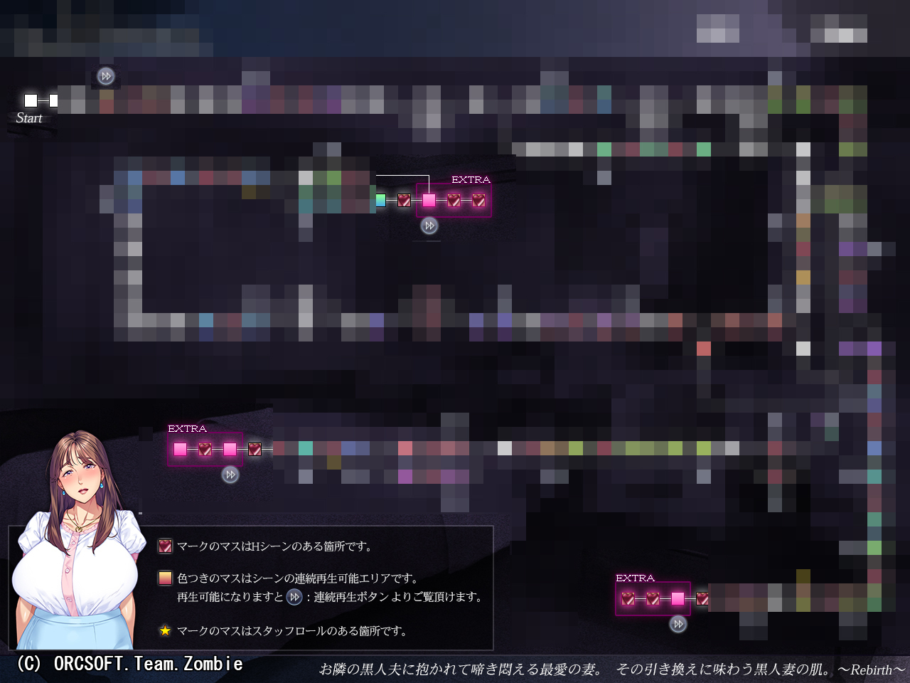 今作のシーン再生は、Hシーンのみだけではなく、全ての通常シーンも再生可能です。フローチャートの形態を取っており、どのような分岐を経てどのようなシーンを見ているのかということが確認し易くなっております。またHシーンは